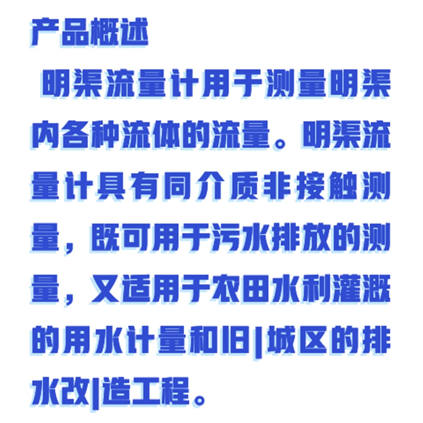 产品概述明渠流量计用于测量明渠内各种流体的流量。明渠流量计具有同介质非接触测量,既可用于污水排放的测量,又适用于农田水利灌溉的用水计量和旧|城区的排水改|造工程。测量原理当被测介质通过堰槽形成自由流时,其流量与堰槽上游水位形成对|应关系,通过测量水位的|高|度再进行一系列换算就可以得出相|应|流体的瞬|时流量。产品特点非接触测量 4-20mA电流输出 DA电流双继电器,支持上、下限报|警|输出 RS485传输信号输出,支持ModBus协议 LCD液晶显示窗 支架安装、法兰安装(可选) 自|动温度补偿系统,中英文操作界面(全|槽型无英文界面) 技术参数 供电电源 AC220V/24V可选、50Hz交流供电 人|机接口 屏幕分辨率:128*64 按键SHOU|命:>100万次 信号输出 模拟电流:4-20mA、负载750Ω、 开 关 量:多路继电器、220VAC/ 2 A 数字信号:RS485,Modbus协议 环境特|性 环境温度 -25 — +60℃ 相|对湿度 45% — 75%RH 压力范围:±0.1MPa 量程范围 量 程:0~10000L/s 分辨率:0.01 精 度:±3%FS 重复性:±5mm |